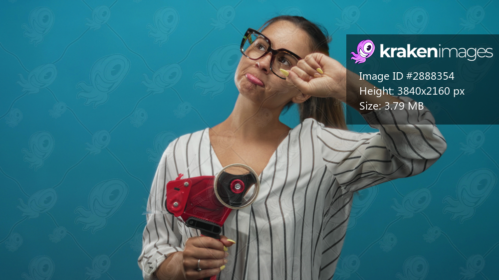 Woman holding red tape dispenser rubbing eye in blue studio wearing striped blouse and glasses; frustration packaging.