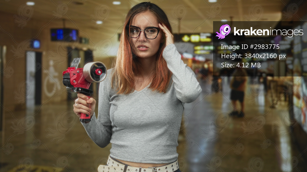 Woman holding red tape dispenser and rubbing temple while wearing glasses in a crowded airport terminal with blurred travelers and signage; frustration delay. - Kraken Images