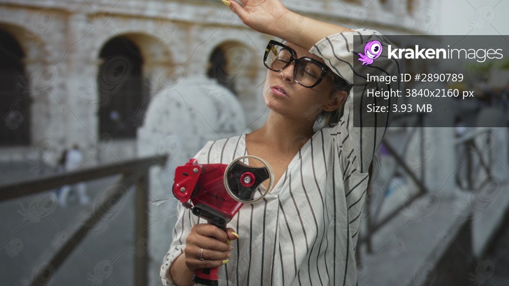 Woman holding red tape dispenser and wiping forehead in front of roman coliseum building while wearing glasses and striped blouse; fatigue.