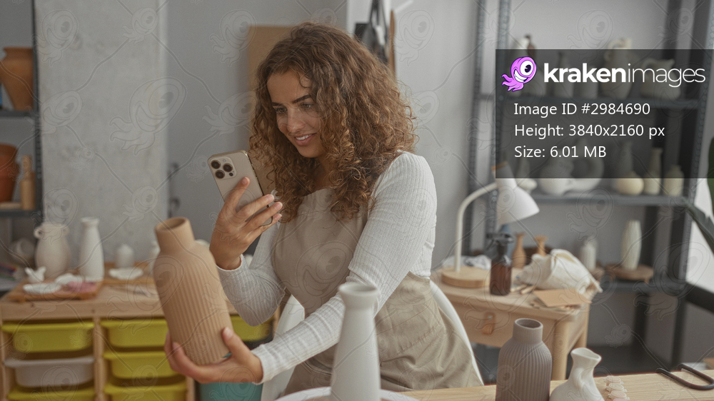 Woman holding ribbed ceramic vase and checking smartphone while wearing apron at pottery studio workspace with shelves of finished pottery; calm creativity. - Kraken Images