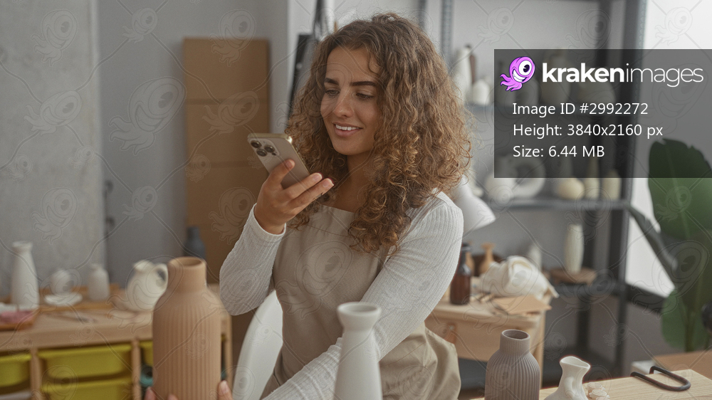Woman holding ribbed ceramic vase and checking smartphone while wearing apron at pottery studio workspace with shelves of finished pottery; calm creativity. - Kraken Images