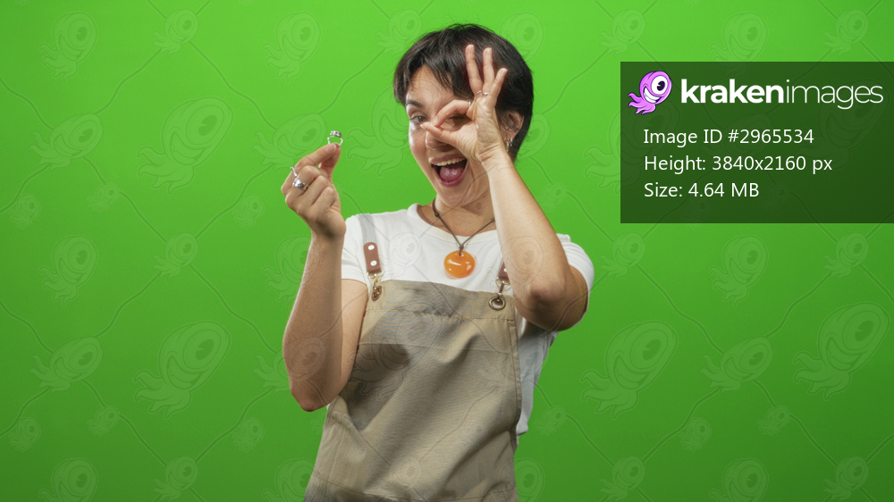 Woman holding ring between fingers, makes ok sign near eye in studio; careful craftsmanship curiosity.
