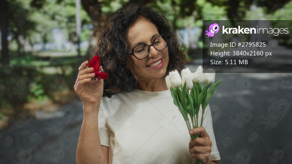 Woman holding ring box and bouquet during proposal in park, smiling hispanic middle-aged lady outdoors with flowers and engagement ring suggesting romantic summer setting. - Kraken Images