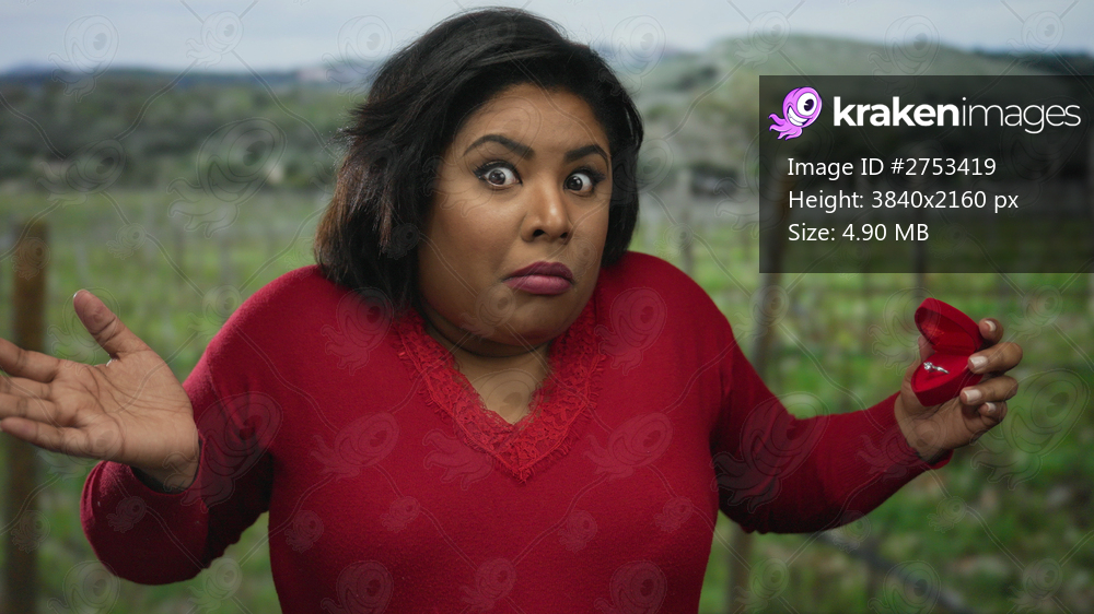 Woman holding ring box in park with curious expression, wearing red sweater in outdoor setting, revealing a surprising proposal scene with a plus size woman in focus. - Kraken Images
