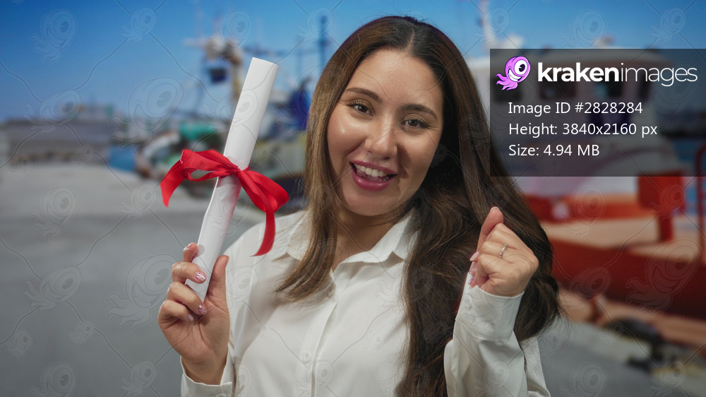 Woman holding rolled diploma in her hand and pumping fist at a busy port dock by a red boat; pride success.
