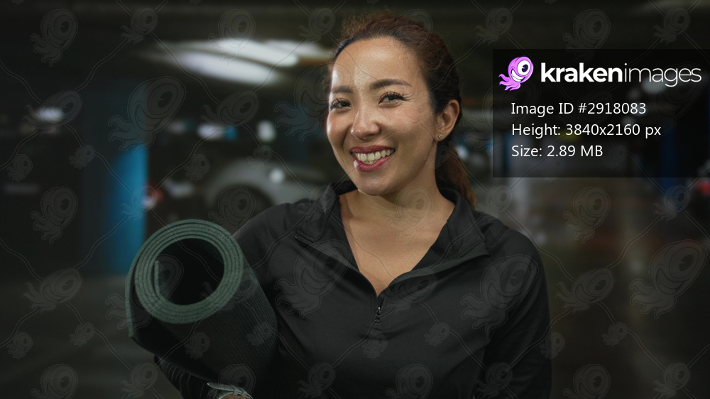 Woman holding rolled yoga mat and smiling in a parking building with cars and concrete pillars; fitness wellness calm.