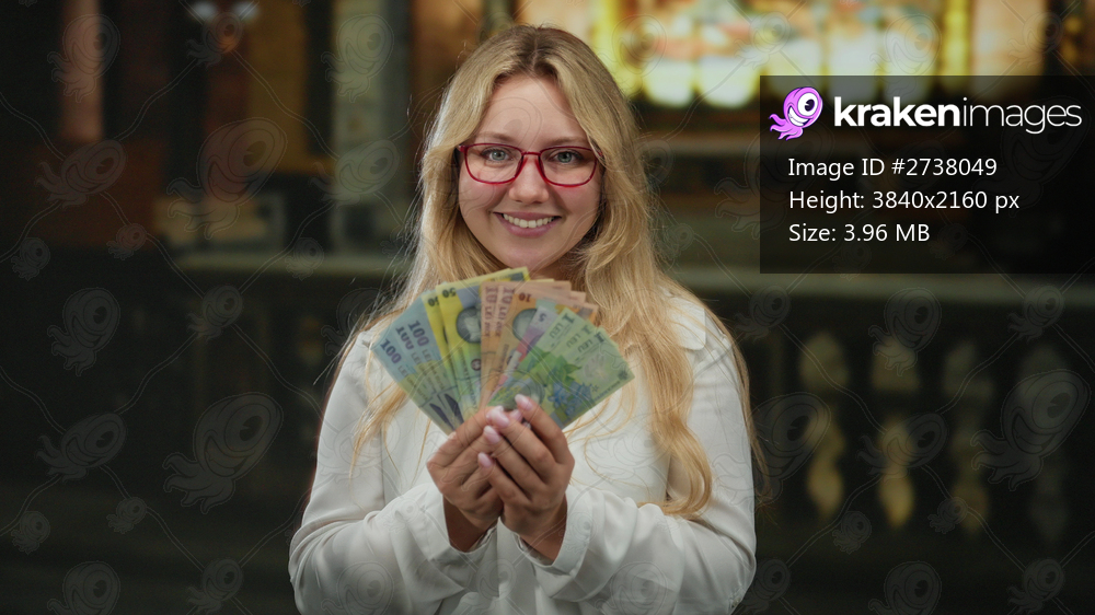 Woman holding romanian banknotes smiling inside church environment with money and colorful stained glass in background enhancing spiritual wealth contrast. - Kraken Images