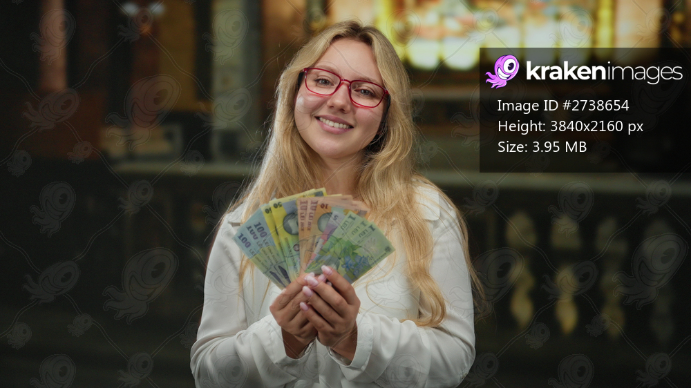 Woman holding romanian banknotes smiling inside church environment with money and colorful stained glass in background enhancing spiritual wealth contrast. - Kraken Images
