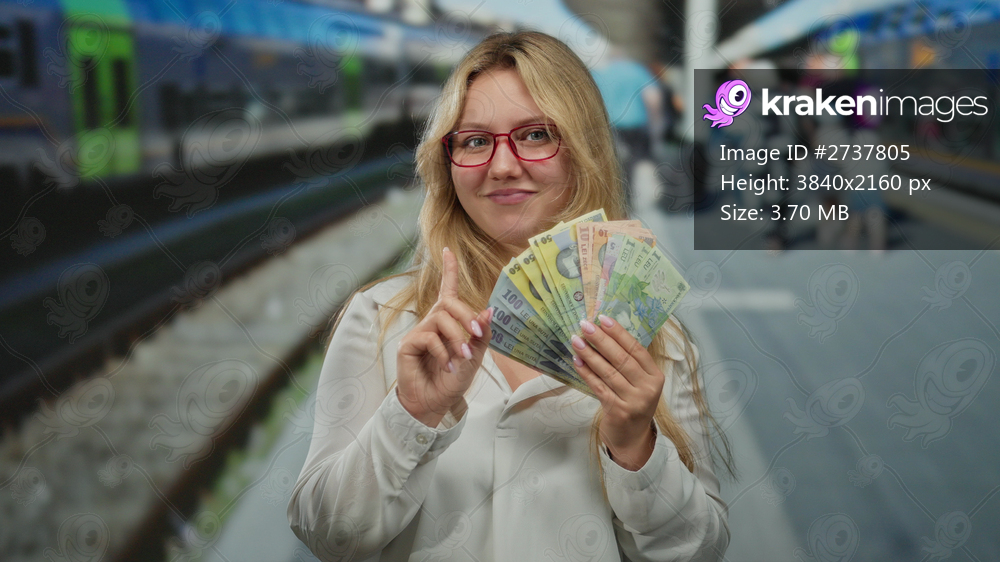 Woman holding romanian lei banknotes at a train station, showcasing currency in an outdoor railway setting with a playful gesture and confident expression. - Kraken Images