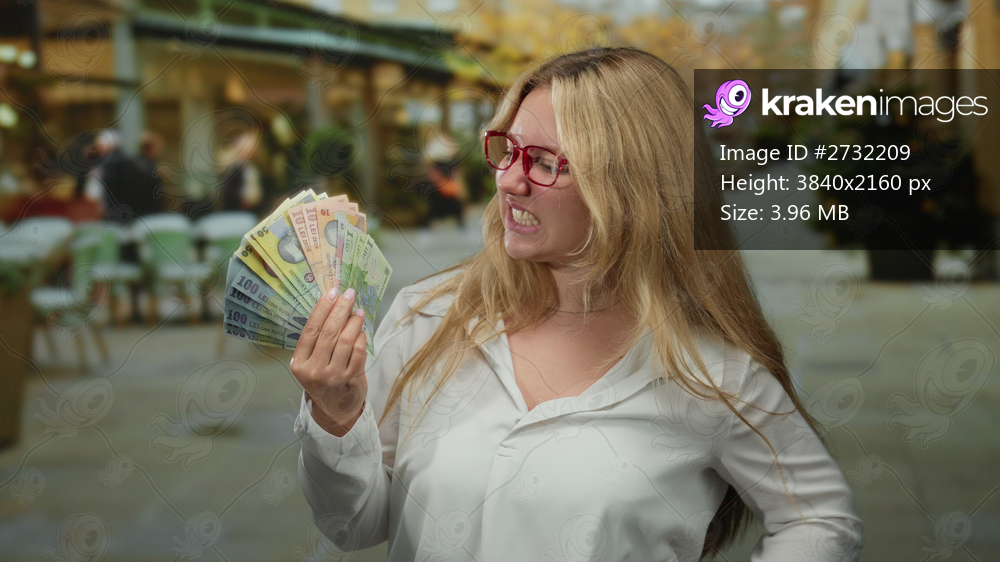 Woman holding romanian lei banknotes outdoors in a city street, expressing emotions with eyeglasses and blonde hair, highlighting the vibrant romanian currency and urban environment. - Kraken Images