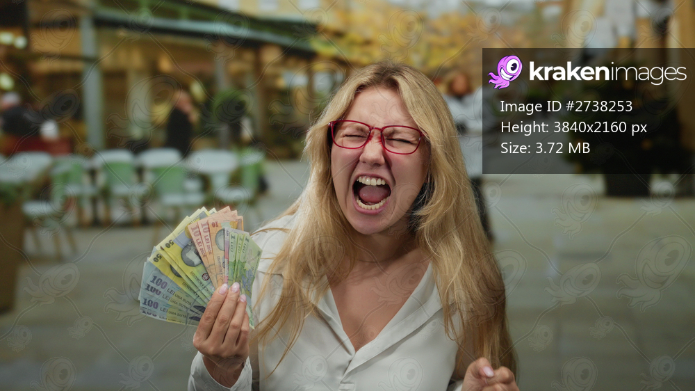 Woman holding romanian lei banknotes outdoors in a city street, expressing emotions with eyeglasses and blonde hair, highlighting the vibrant romanian currency and urban environment. - Kraken Images