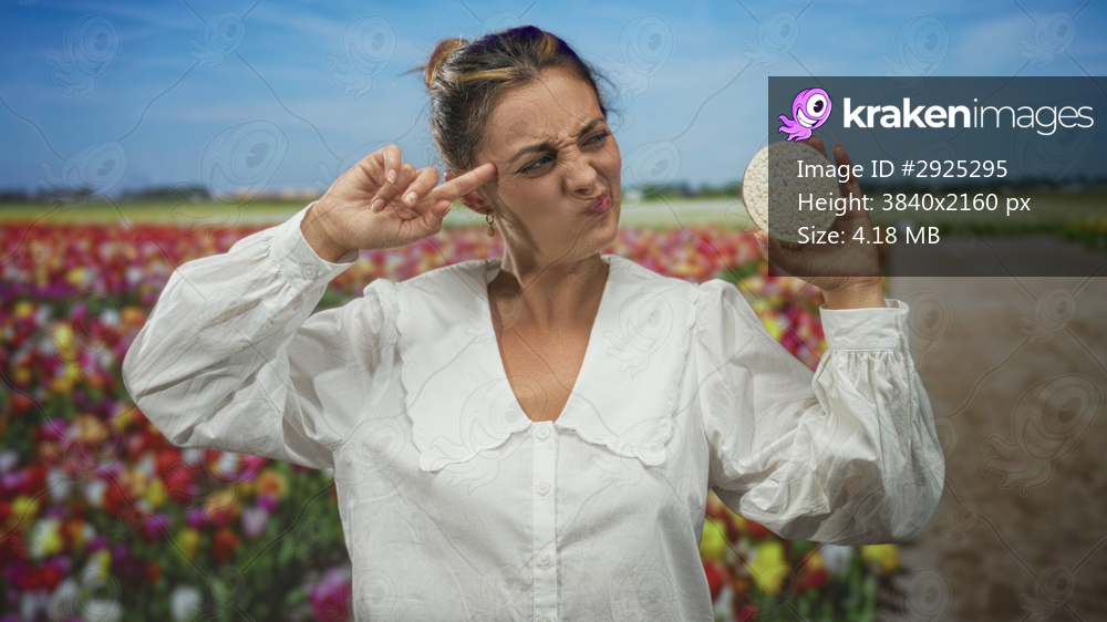 Woman holding round rice cake and points finger to temple in studio set with tulip field backdrop; skepticism.
