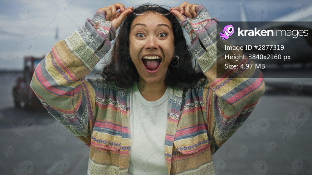 Woman holding round sunglasses above her head with mouth wide open at airport terminal near plane tarmac; surprise travel adventure.