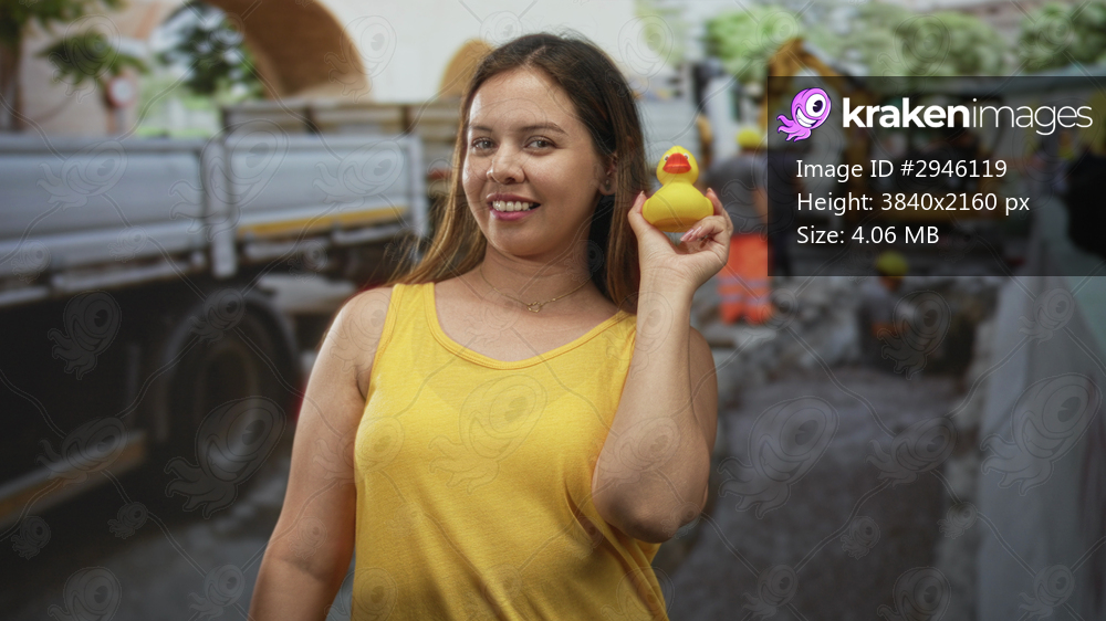 Woman holding rubber duck by hand at building construction site while smiling near truck and excavator, wearing yellow tank top; playful optimism.