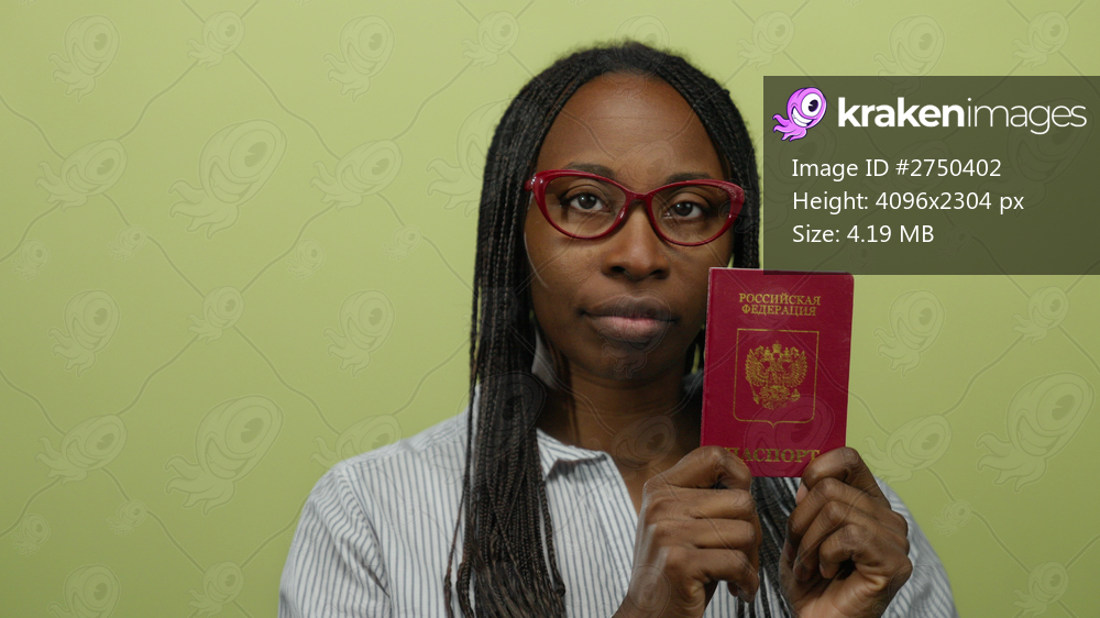 Woman holding russian passport against yellow background wearing glasses and striped shirt, depicting travel and identity concepts.
