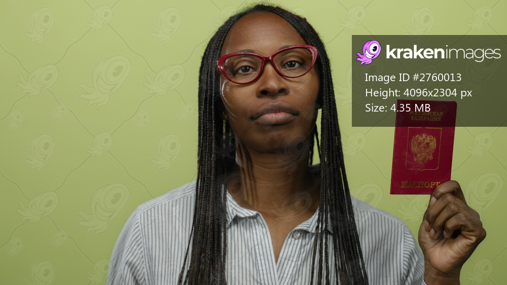 Woman holding russian passport against yellow background wearing glasses and striped shirt, depicting travel and identity concepts.