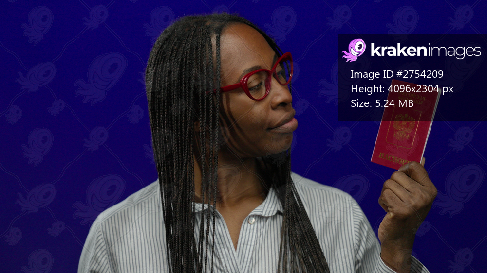 Woman holding russian passport in front of blue background, wearing glasses and striped shirt, conveying international travel and identity concepts.