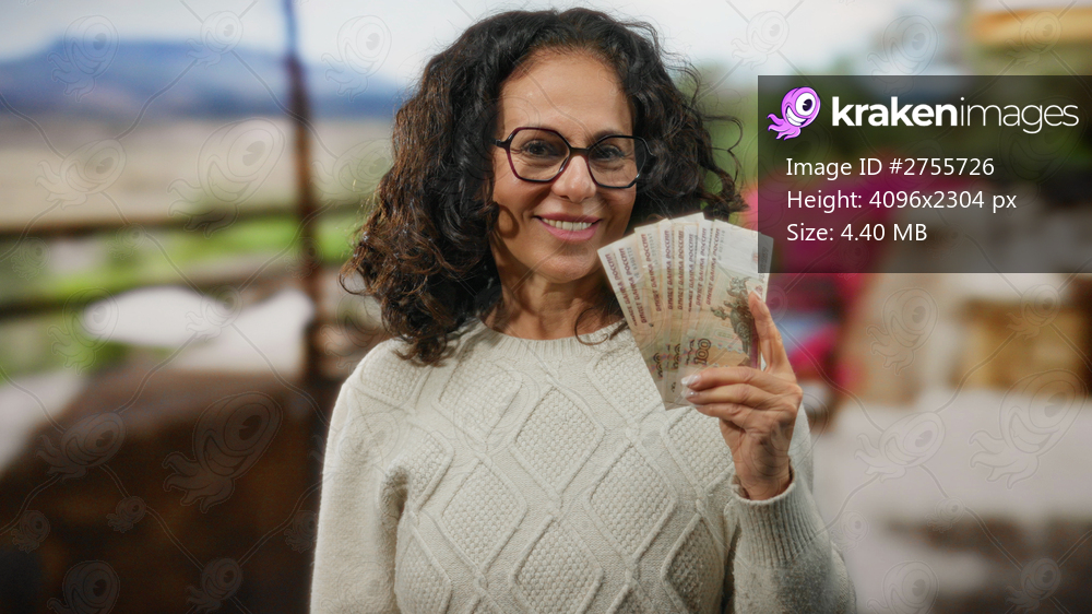 Woman holding russian rubles on a sunny restaurant terrace, suggesting financial success and relaxation outdoors.