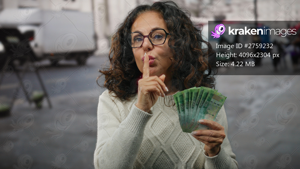 Woman holding russian rubles on city street making quiet gesture suggesting secrecy in public setting wearing glasses and sweater in an urban environment with blurred vehicles. - Kraken Images