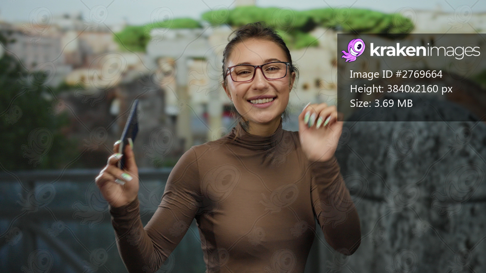 Woman holding saint lucia passport smiles near ancient roman ruins under sunny skies, highlighting travel and identification themes.