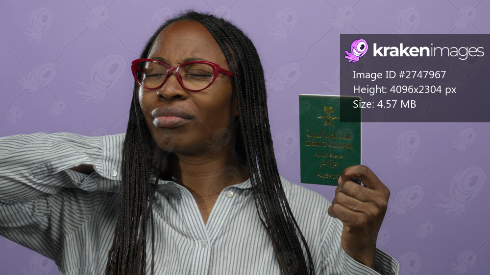 Woman holding saudi arabian passport against purple background, wearing glasses and striped shirt, appearing thoughtful.