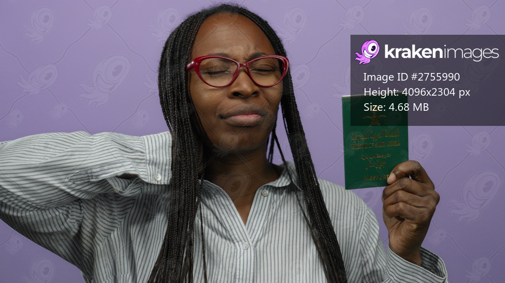 Woman holding saudi arabian passport against purple background, wearing glasses and striped shirt, appearing thoughtful.