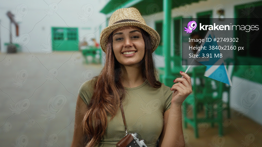 Woman holding scotland flag on restaurant terrace wearing hat and smiling with camera in hand during travel.