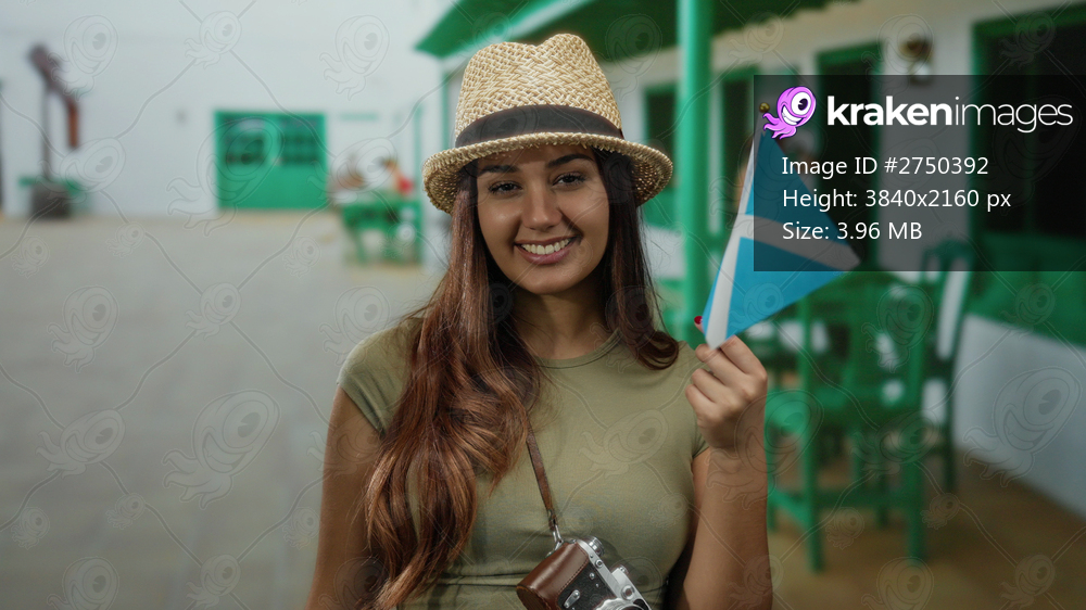 Woman holding scotland flag on restaurant terrace wearing hat and smiling with camera in hand during travel.