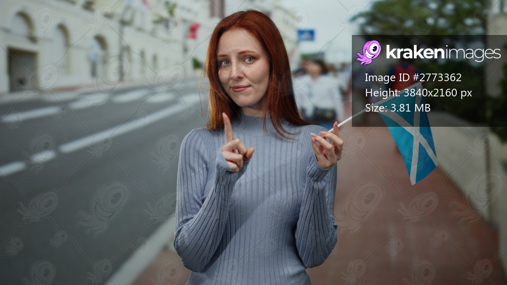 Woman holding scottish flag on city street while gesturing displeasure, showcasing a vibrant casual outdoor setting with focus on redheaded adult female. - Kraken Images