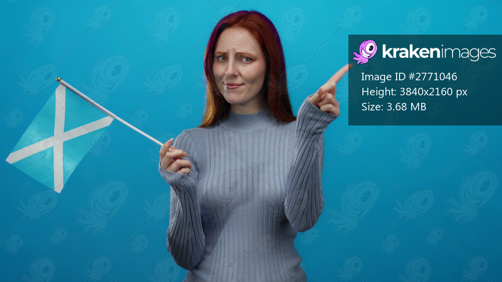 Woman holding scottish flag with red hair gestures no against blue background, conveying caution with finger expression.