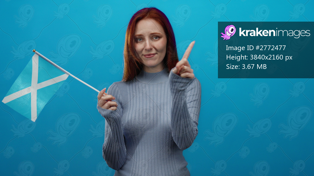 Woman holding scottish flag with red hair gestures no against blue background, conveying caution with finger expression.
