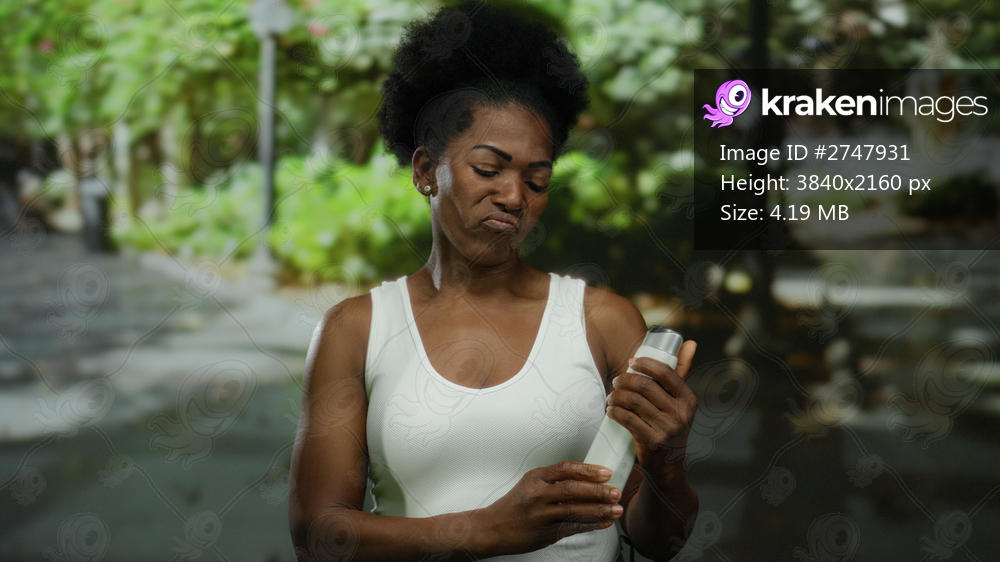 Woman holding shampoo outdoors in a park setting, wearing casual attire, expressing uncertainty while surrounded by lush greenery.