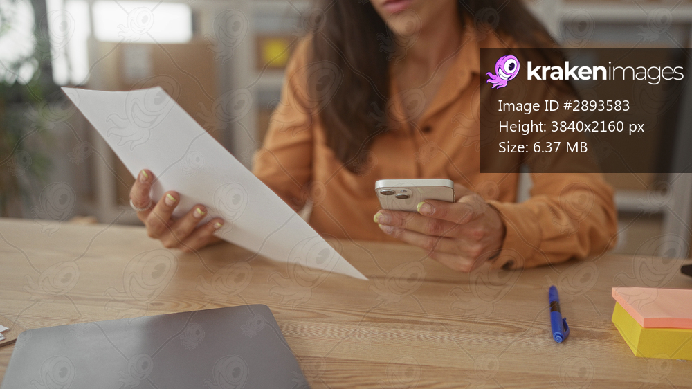 Woman holding sheet of paper and smartphone while checking delivery details at a packing desk in an office building; concentration.