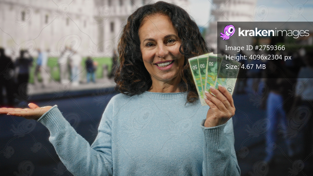 Woman holding shekels in front of pisa tower in italy, presenting green banknotes with a smile, middle-aged in outdoor city setting, showcasing travel and finance. - Kraken Images