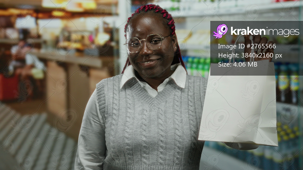 Woman holding shopping bag indoors at supermarket, displaying a content smile amidst colorful aisles, showcasing everyday market setting, casual and inviting atmosphere.
