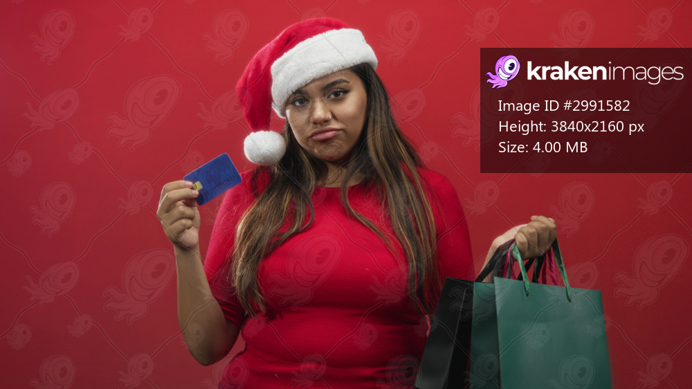 Woman holding shopping bags and a creditcard, wearing a santa hat and frowning while holding up the card, studio; holiday frustration.