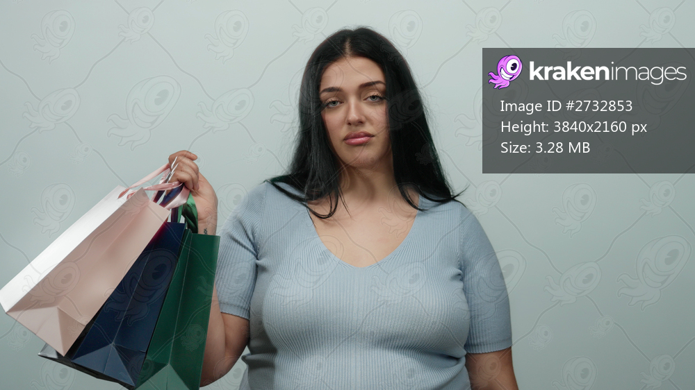 Woman holding shopping bags on white background wearing blue shirt showing curvy plus size figure with a neutral expression.