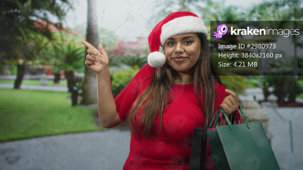 Woman holding shopping bags points finger to left on street while wearing santa hat and smiling; holiday cheer.