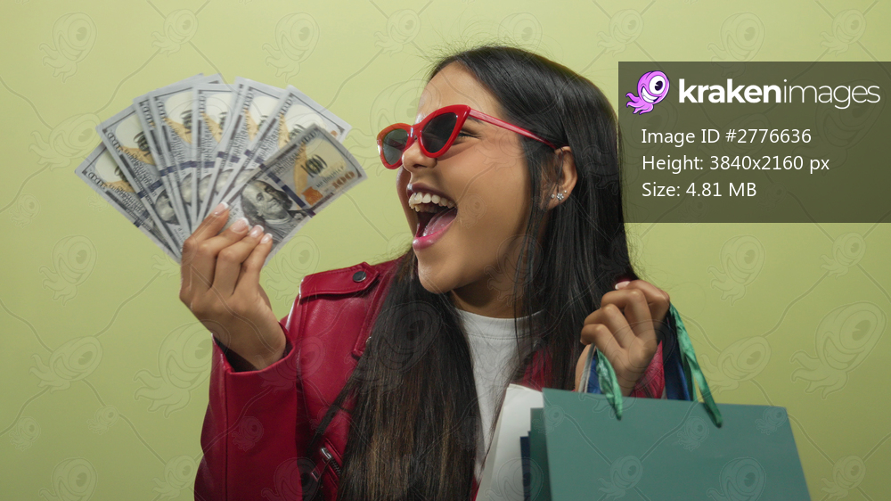 Woman holding shopping bags and us dollars joyfully smiles in red jacket and sunglasses against an isolated yellow background, capturing the essence of shopping and wealth. - Kraken Images