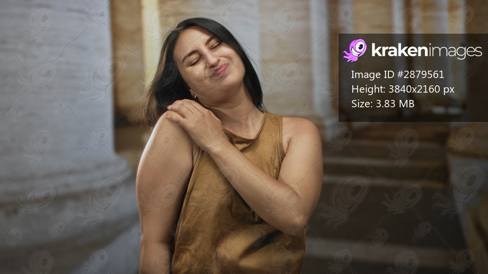 Woman holding shoulder and wincing in front of a stone building colonnade wearing brown tanktop; discomfort.
