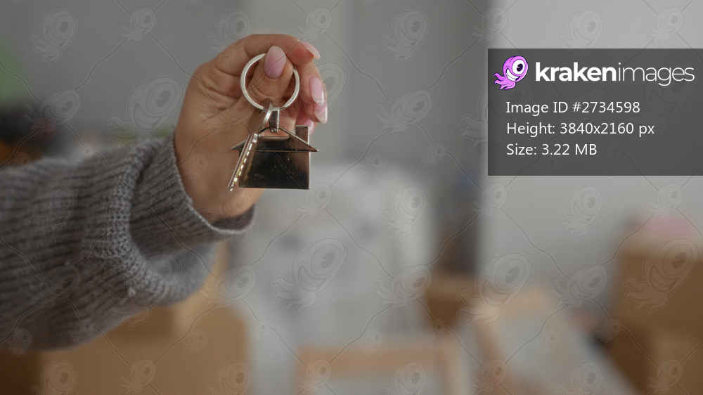 Woman holding silver house keys in a cozy living room, symbolizing new home ownership and interior design in a modern apartment.