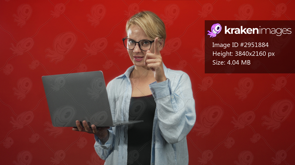 Woman holding silver laptop and pointing finger to camera while wearing glasses and a light blue shirt in studio; invitation engagement connection.