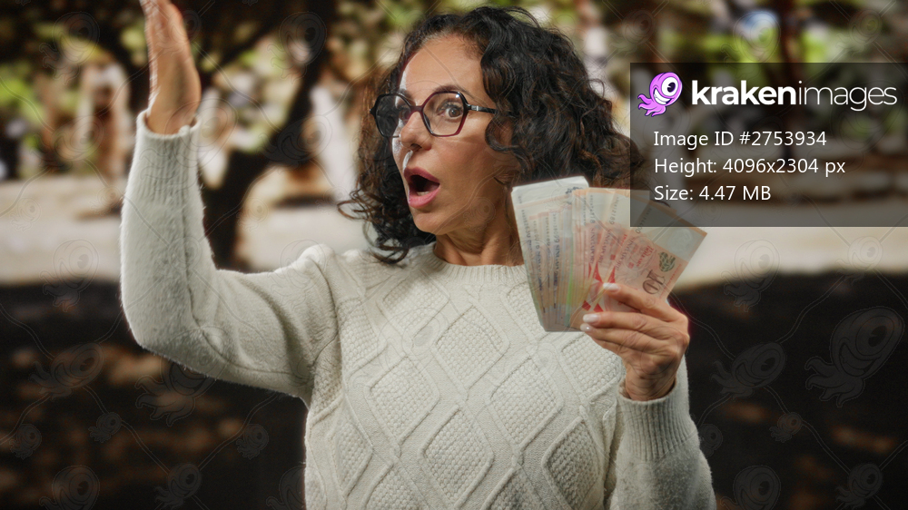 Woman holding singapore dollars outdoors in a park, expressing surprise, with lush green garden background.