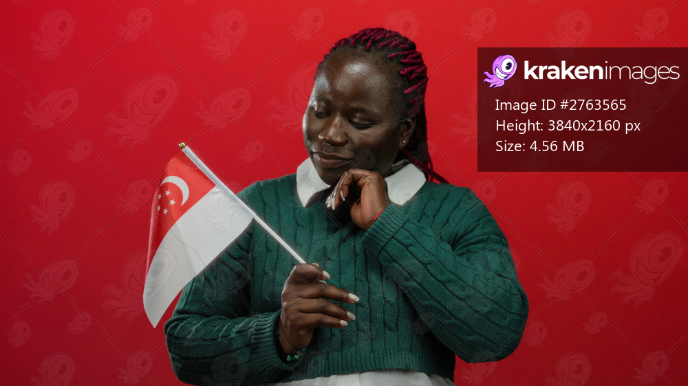 Woman holding singapore flag against isolated red background looking confident and proud with expressive gesture wearing green sweater.