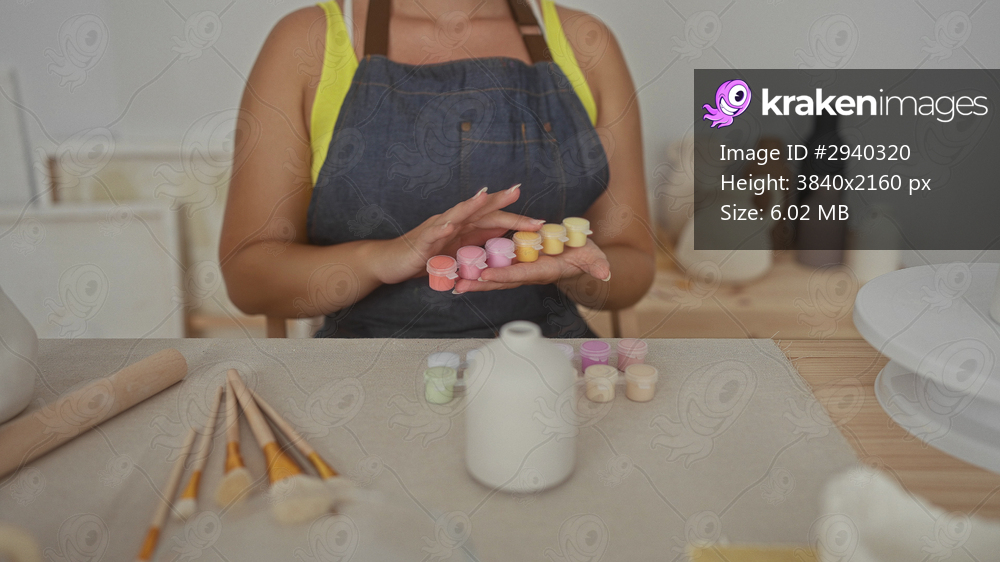Woman holding small paint pots on her palm and tapping a pastel color with finger while seated at a pottery studio table; creativity calm.