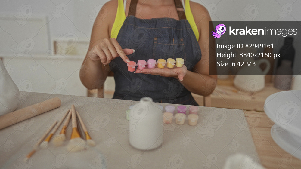Woman holding small paint pots on her palm and tapping a pastel color with finger while seated at a pottery studio table; creativity calm.