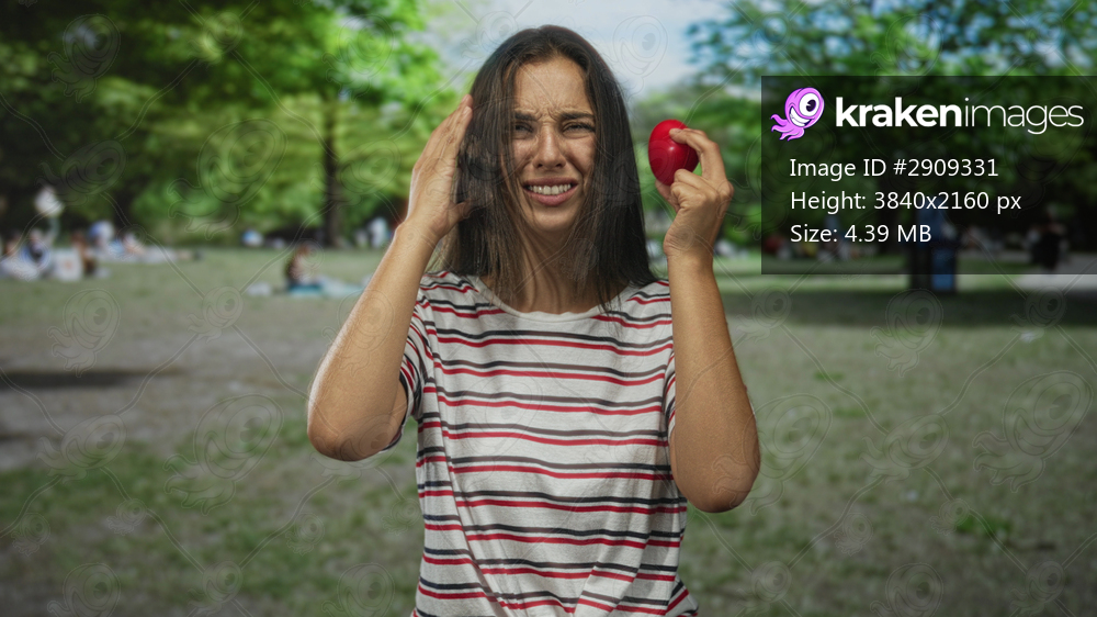 Woman holding small red ball with hand to head and squinting in forest park under trees and sunlight; pain headache.