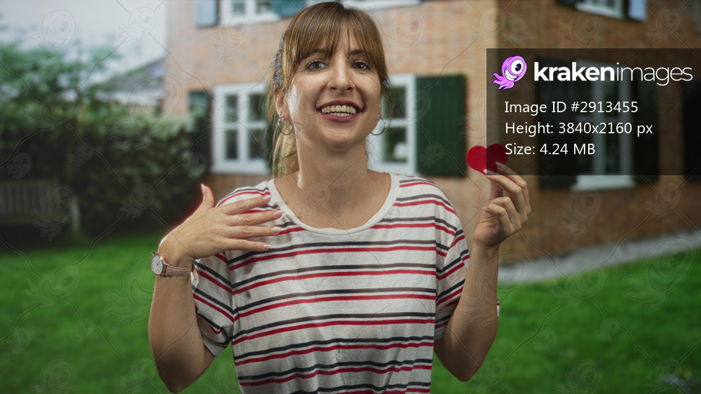 Woman holding small red heart between fingers in front of building, smiling and raising her hand near chest; playful affection warmth.