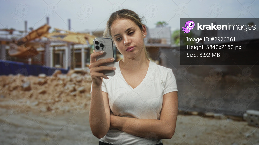 Woman holding smartphone with arms crossed at building site, looking at screen; boredom waiting delay.