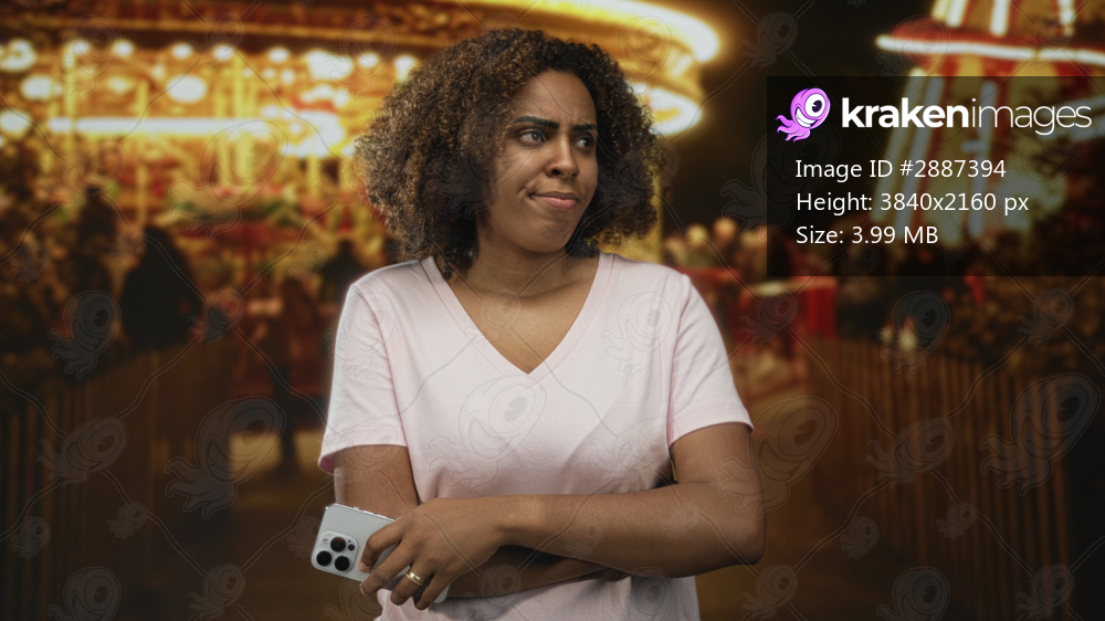 Woman holding smartphone with arms crossed at street fair at night, looking annoyed and uneasy; annoyance waiting crowd.